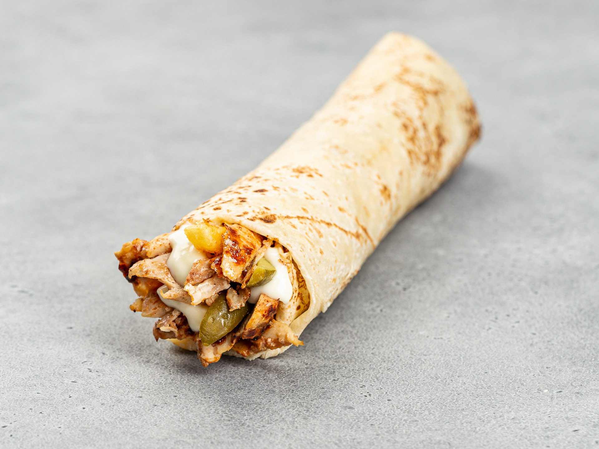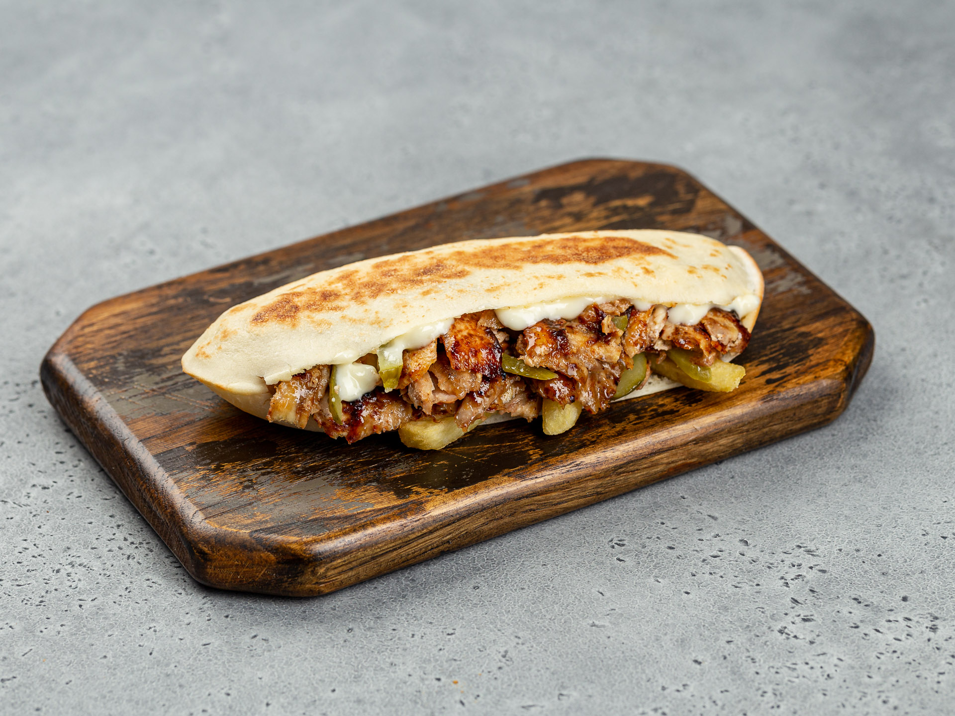 خبز صاج شاورما دجاج , صوص الثوم ,مخلل ,فرايز