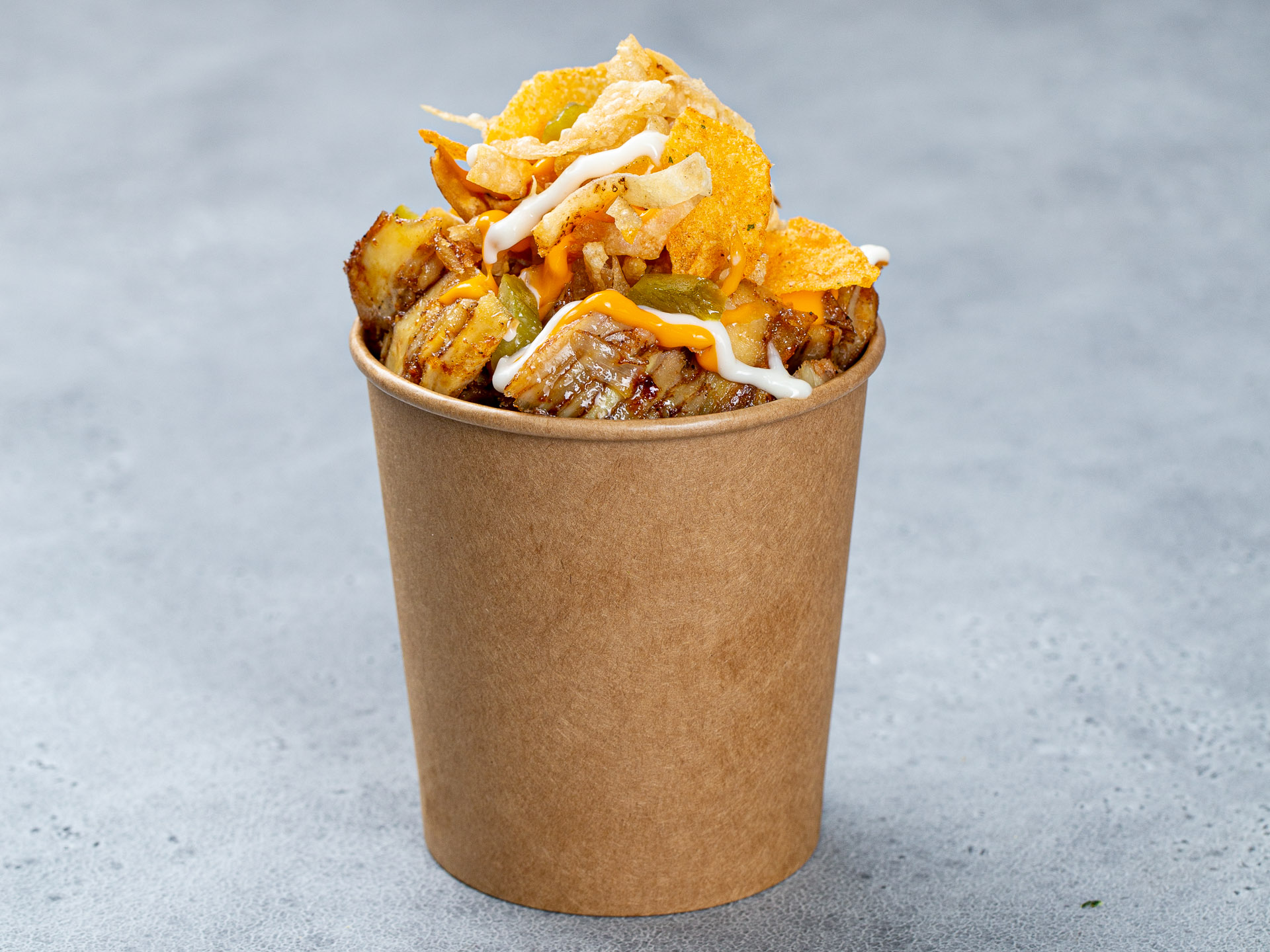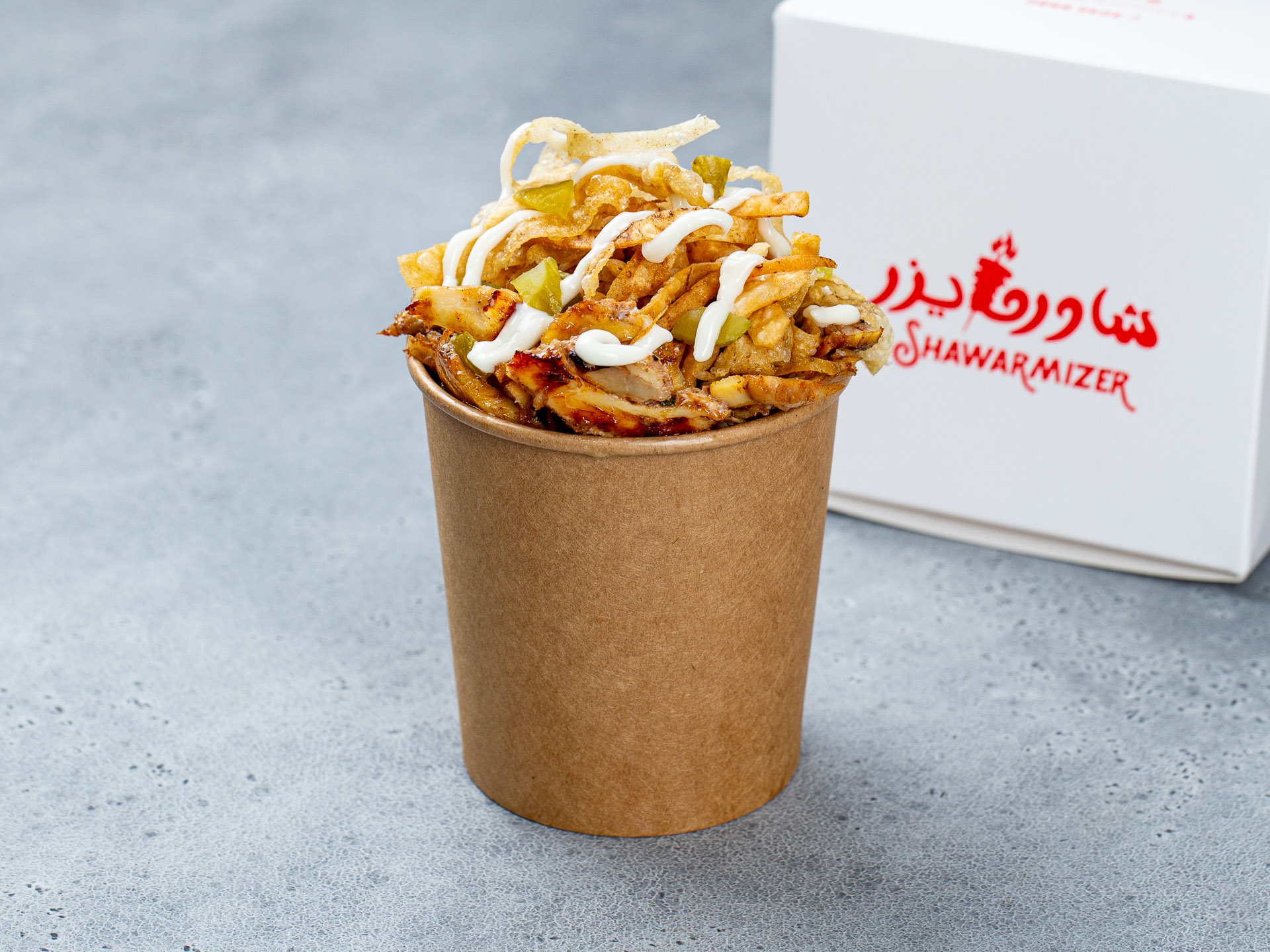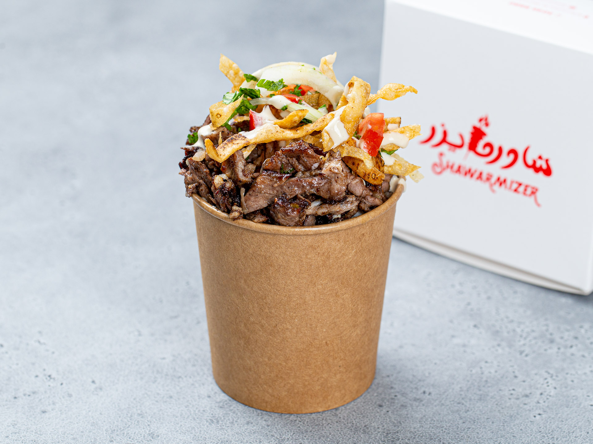 سلطة شاورما مع الخبز المقرمش وصوص الثوم وخيار المخلل وومخلل الهالبينو وشيبس عمان وصوص الجبن
