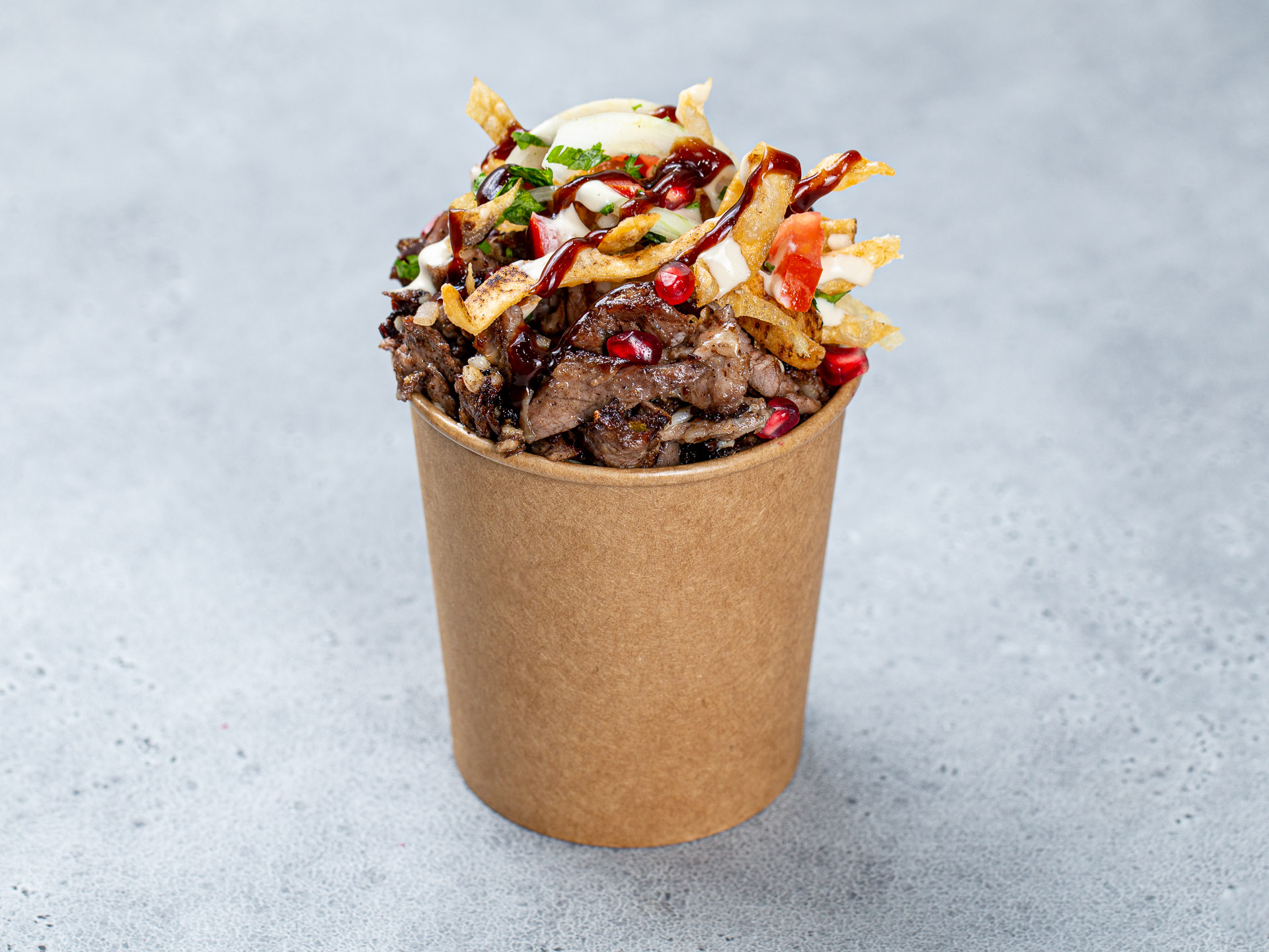 سلطة شاورما مع الخبز المقرمش وصوص الجبن و سماق و بقدونس و طحينية و بصل