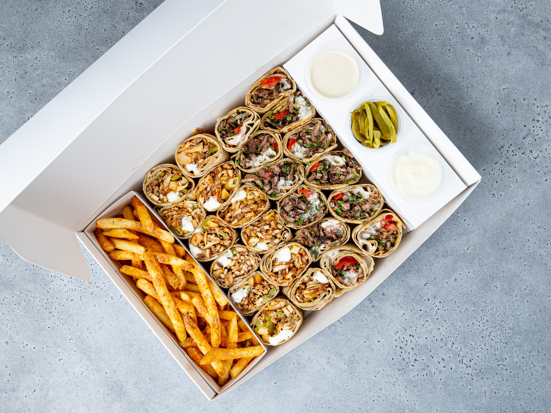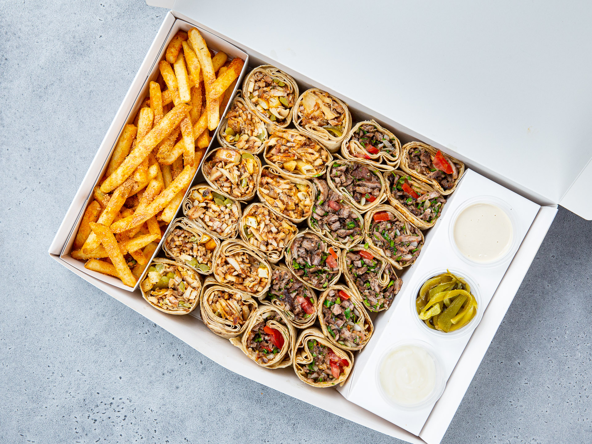 أربعة شاورما لحم +أربعة شاورما دجاج + فرايز +ثلاثة مشروب غازي |